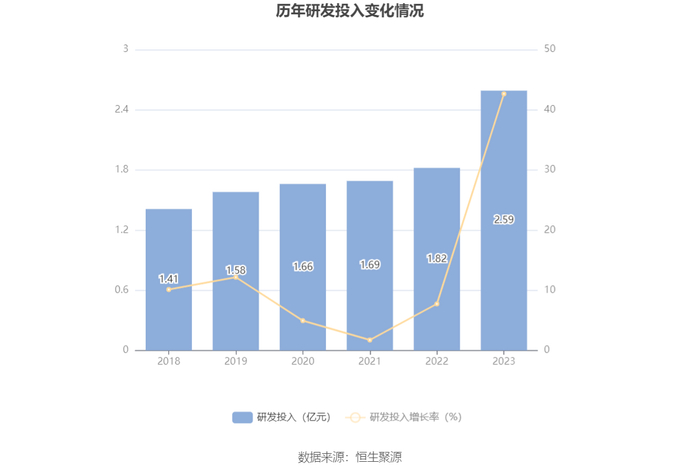 2023年全年,公司研发投入金额为2.59亿元,同比增长42.64%;研发投入占营业收入比例为4.76%,相比上年同期上升0.63个百分点。此外,公司全年研发投入资本化率为0。