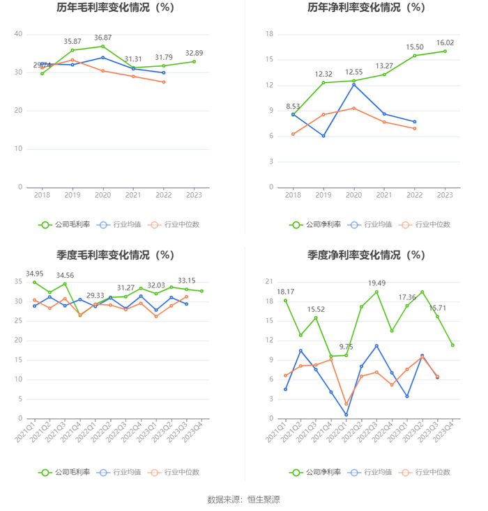 2023年,公司毛利率为32.89%,同比上升1.10个百分点;净利率为16.02%,较上年同期上升0.52个百分点。从单季度指标来看,2023年第四季度公司毛利率为32.71%,同比下降0.70个百分点,环比下降0.44个百分点;净利率为11.31%,较上年同期下降2.20个百分点,较上一季度下降4.40个百分点。