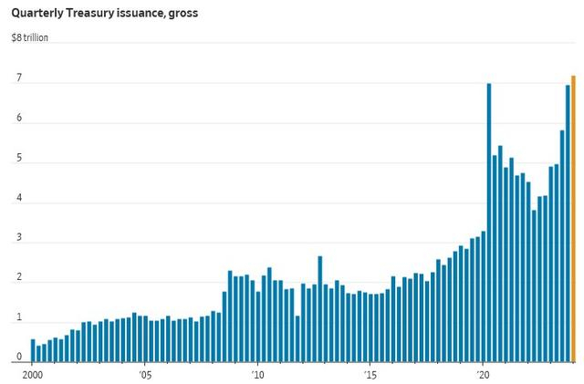 据Apollo Global Management首席经济学家Torsten Slok称,仅在2024年,就有创纪录的8.9万亿美元国债(约占美国未偿债务的三分之一)将到期。