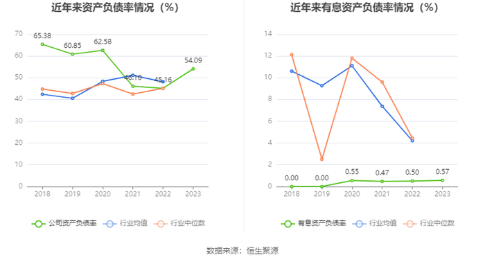 在偿债能力方面,公司2023年年末资产负债率为54.09%,相比上年末上升8.93个百分点;有息资产负债率为0.57%,相比上年末上升0.07个百分点。