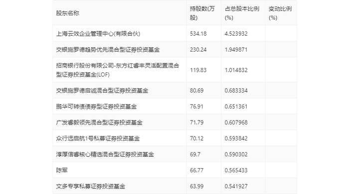 年报显示,2023年年末公司十大流通股东中,新进股东为招商银行股份有限公司-东方红睿丰灵活配置混合型证券投资基金(LOF)、鹏华可转债债券型证券投资基金、淳厚信睿核心精选混合型证券投资基金、陈军,取代了三季度末的汇泉策略优选混合型证券投资基金、鹏华弘嘉灵活配置混合型证券投资基金、中欧时代先锋股票型发起式证券投资基金、上海文多资产管理中心(有限合伙)-文多稳健一期基金。在具体持股比例上,文多专享私募证券投资基金持股有所上升,上海云效企业管理中心(有限合伙)、交银施罗德趋势优先混合型证券投资基金、交银施罗德启诚混合型证券投资基金、广发睿毅领先混合型证券投资基金、众行远启航1号私募证券投资基金持股有所下降。