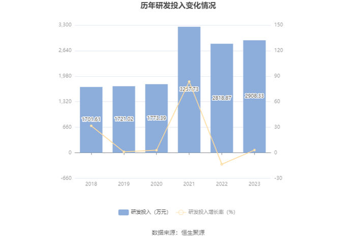 2023年全年,公司研发投入金额为2908.33万元,同比增长3.17%;研发投入占营业收入比例为4.33%,相比上年同期下降1.92个百分点。此外,公司全年研发投入资本化率为0。