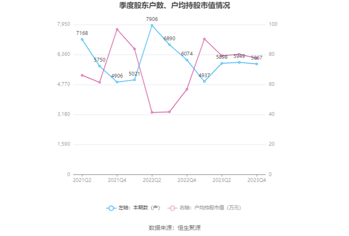 筹码集中度方面,截至2023年年末,公司股东总户数为5867户,较三季度末下降了82户,降幅1.38%;户均持股市值由三季度末的80.23万元下降至77.59万元,降幅为3.29%。