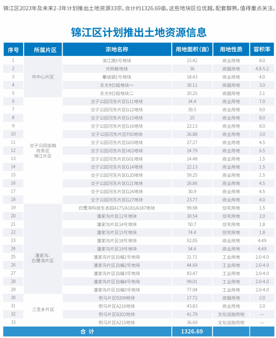 同时,在今年初,锦江区举行了规划设计成果及城市机会清单发布会。在这份清单中,锦江区也披露了今年的供地计划,锦江区的下一步棋,就此水落石出。