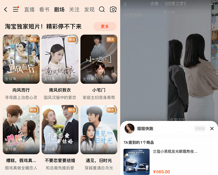 可以说,淘宝短剧的“电商味”还是独树一帜的,在该区块的这些短剧里,我们几乎可以在每部剧播放页面看到淘宝商品的跳转按钮,比如《入职启示录》的左下角挂有「TA提到的宝贝」“娇韵诗”系列商品链接;由兰蔻冠名的《四季之梦》每集播放页则都附有“兰蔻小黑瓶发光眼霜”的商品链接。