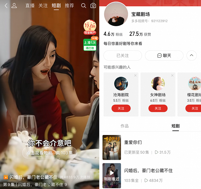 另一方面,可以发现,拼多多短剧的站内传播逻辑与京东相似,都是主要基于平台账号UGC生态来喂养短剧,只不过拼多多的短剧账号不一定是商家,也可能是纯内容账号搭配商品转化链路的玩法。