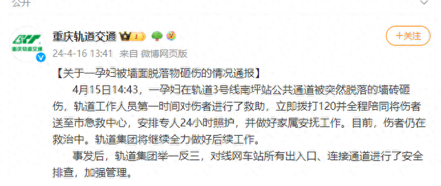 4月15日14:43,一孕妇在轨道3号线南坪站公共通道被突然脱落的墙砖砸伤,轨道工作人员第一时间对伤者进行了救助,立即拨打120并全程陪同将伤者送至市急救中心,安排专人24小时照护,并做好家属安抚工作。目前,伤者仍在救治中。轨道集团将继续全力做好后续工作。