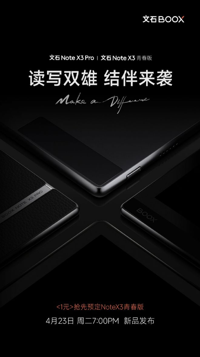 IT之家 4 月 16 日消息,文石发布预告称,Note X3 青春版与 NoteX3 Pro 即将发布,发布会定档 4 月 23 日晚 7 点,官方宣传语为“读写双雄,结伴来袭”。