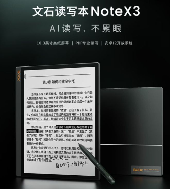 此前文石发布了Note X3电纸书,售价 2599 元。Note X3 屏幕尺寸为 10.3英寸,227 PPI,搭载安卓12开放系统,支持手写笔,采用新款高通8核2.4GHz处理器,配备4GB内存和64GB存储空间,支持TF卡扩展。