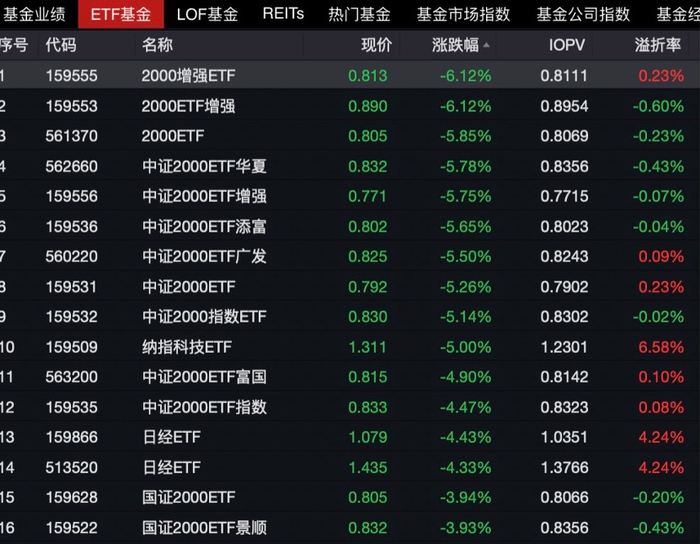 股票ETF中,2000指数相关ETF成为重灾区,2只2000增强ETF跌幅超过6%,不少基金出现了折价,卖盘抛压较大。