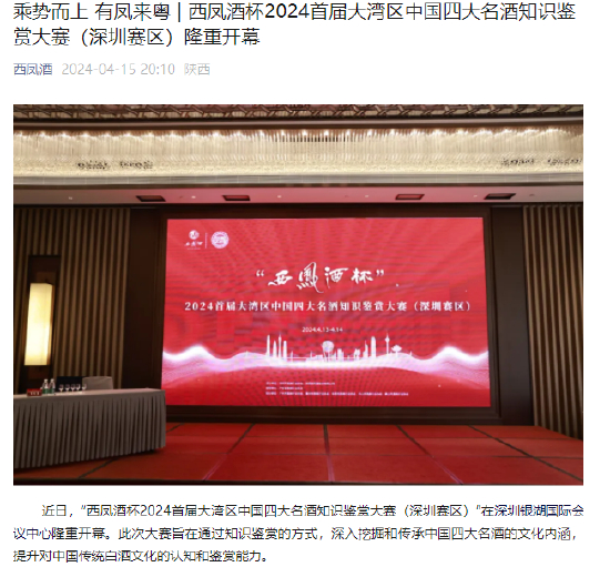 据西凤酒官微4月15日消息,西凤酒在深圳举行了“西凤酒杯2024首届大湾区中国四大名酒知识鉴赏大赛”。