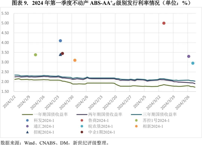 一季度不动产ABS发行利率整体下行,除个别产品发行利率偏高,AAAsf级证券发行利率整体维持3%左右,AA+sf级证券发行利率大部分位于3.5%以内。