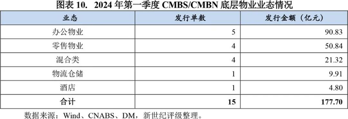 从底层物业的业态来看,2024年第一季度,以办公物业为底层物业的CMBS/CMBN产品共计5单,发行规模为90.83亿元,规模占比为51.11%。办公物业既有产业园区的办公楼,也有市中心的写字楼。由此可见,运营稳定的办公物业依然是CMBS/CMBN的首选资产。