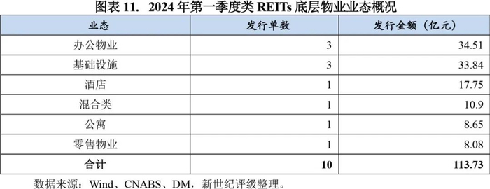 2024年第一季度,以办公物业为底层物业的类REITs共计3单,规模为34.51亿元,规模占比为30.34%。