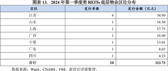 2024年第一季度,类REITs的底层物业中,办公、酒店、零售物业等商业物业分布在上海、江苏和广东等经济发达地区,清洁能源基础设施则位于四川、宁夏和广西等自然资源丰裕区域。