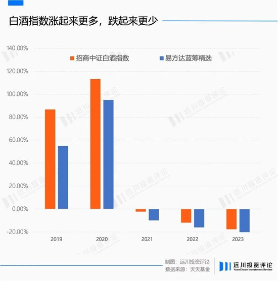 张坤选择了用其他的白酒来填补部分仓位,然后在其他行业中寻找龙头来一定程度上分散组合风险。结果在2019年和2020年的牛市里跑不赢更集中的白酒ETF。按理说牺牲了收益,也该分散了风险,可2021年到2023年的熊市里又连续三个年度比白酒指数跌得更多,堪称越主动越不幸。