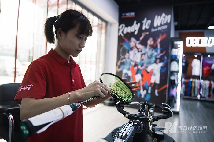 店铺里最忙碌的当属穿线师,至少有4位穿线师在马不停蹄地给球拍穿线,“最近需要穿线的球友比较多,穿线师从上周开始就加班,店铺每天穿线的拍子超过100把。”刘芳说。