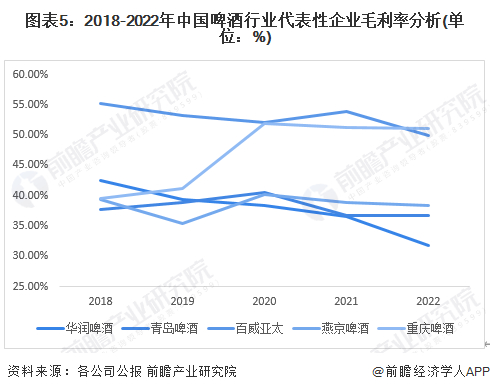 2018-2022年,行业代表性企业的毛利率呈现波动下降的趋势,但平均水平保持在约40%左右。总体来看,啤酒企业的毛利率在30%至50%之间波动,而百威亚太和重庆啤酒这两家布局高端市场的企业毛利率较高。