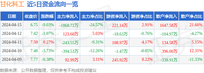 4月15日的资金流向数据方面,主力资金净流出1868.72万元,占总成交额24.57%,游资资金净流入221.14万元,占总成交额2.91%,散户资金净流入1647.58万元,占总成交额21.66%。