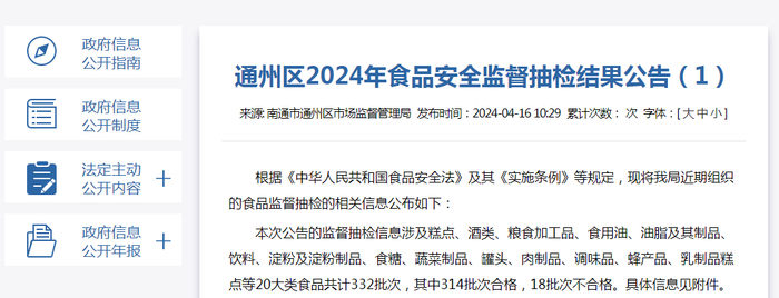 江苏省南通市通州区2024年食品安全监督抽检结果公告