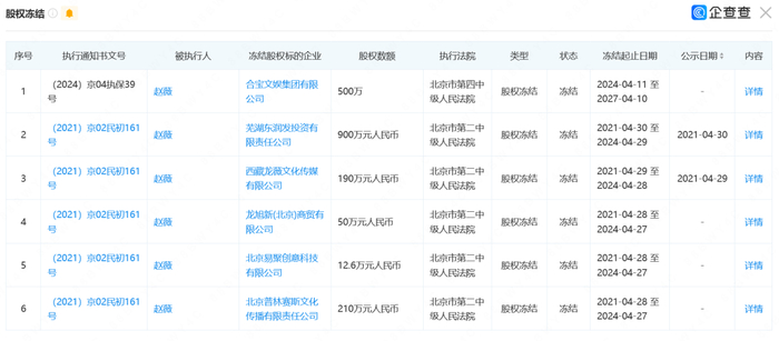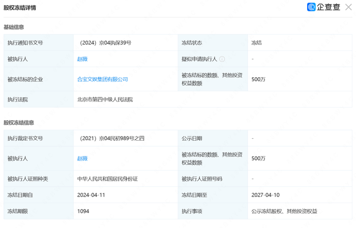 企查查显示,4月11日,赵薇名下部分所持股权被冻结,冻结股权标的企业为合宝文娱集团有限公司,冻结日期至2027年4月10日,执行法院为北京市第四中级人民法院,被冻结股权金额为500万元人民币。