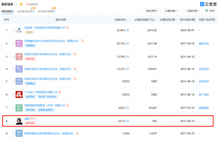 股东信息显示,赵薇持有该公司股份比例为4.51%,首次持股日期为2015年8月10日。