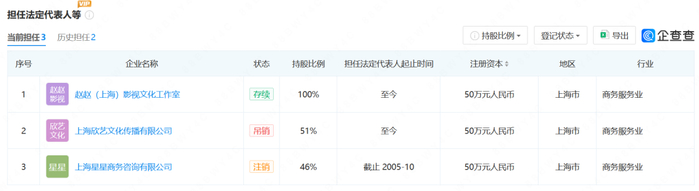 企查查APP显示,赵薇当前担任3家公司的法定代表人,其中仅赵赵(上海)影视文化工作室一家存续,其余两家分别为吊销、注销状态。
