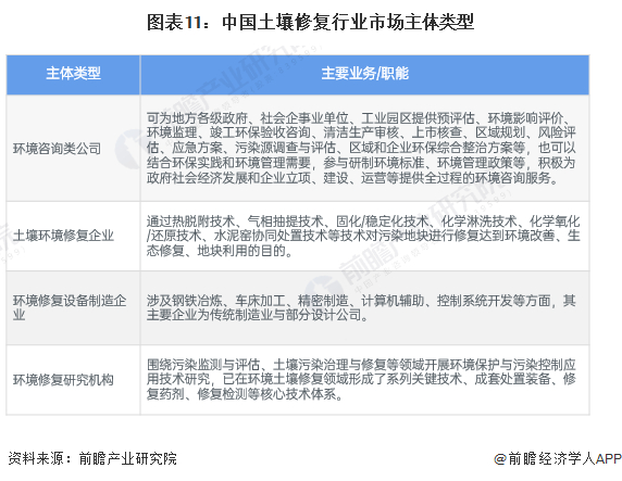 土壤修复产业的主体主要包括了环境咨询服务类公司、环境修复类公司、修复设备类公司、修复药剂类公司、环境监测类公司以及环境修复研究院等主要6类企事业单位。其中环境修复企业在资金、企业规模、企业数量方面成为土壤修复产业引领者。