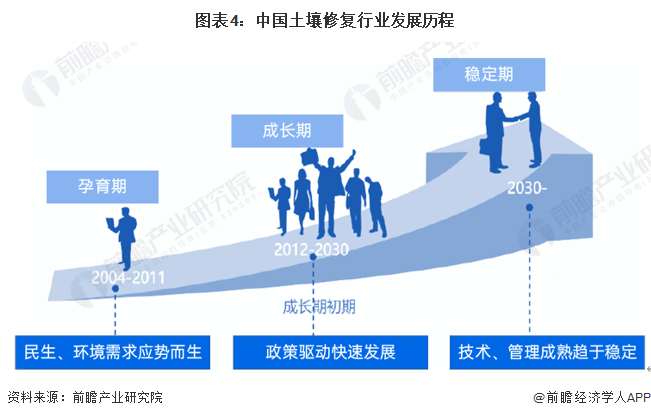 相较国外,国内土壤及地下水修复行业相对国外而言起步较晚,大致划分为三个阶段—孕育期、成长期、稳定期,我国土壤及地下水修复行业目前处于成长期。