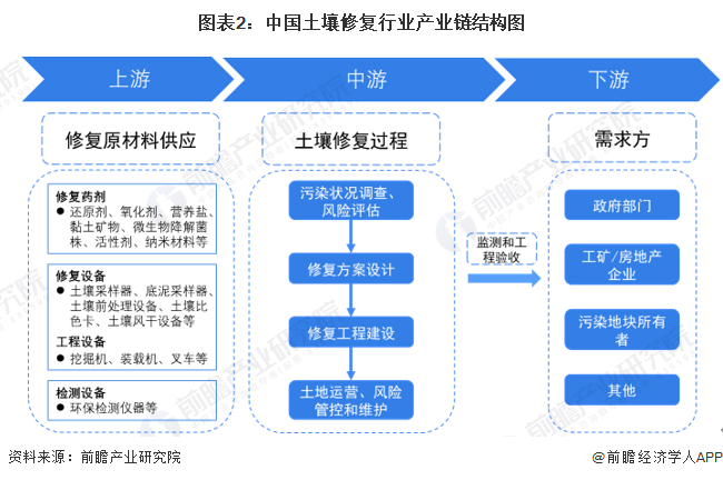 土壤修复产业链的上游(修复用剂、设备供应商等)主要为设备、修复药剂等提供支持和服务;中游业务主要可以分为咨询类(污染状况调查评估与风险评估、方案设计等)和工程类(土壤与地下水风险管控/修复工程),以及后期评估、维护等工作;下游主要是具有土壤修复需求的主体,包括政府部门、工矿/房地产企业、污染场地所有者、环保单位等。