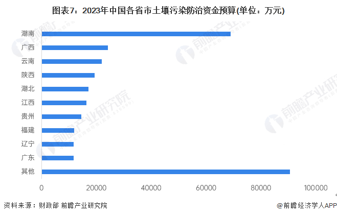 2023年我国土壤污染防治重点区域在湖南、广西、云南等地,其中财政部对于湖南的土壤污染防治资金预算更是遥遥领先,共计6.9亿元,占总资金预算的比重达到22.39%。湖南省地貌类型多样,有色金属的品种和储量都非常可观,受历年来不完善的开采和管理技术的影响,导致土壤的重金属污染问题十分突出,因而财政部着重加大对湖南省土壤污染的防治。其次是广西和云南,土壤污染防治资金预算分别为2.42亿元、2.2亿元,占比为7.85%、7.12%。