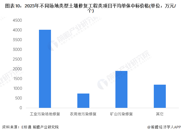 从项目的平均单体价格看,2023年工业污染场地修复项目、农用地污染场地修复项目和矿山污染场地修复项目的平均单体中标价格分别为:4036万元/项目、747万元/项目和1909万元/项目,近3年均价变化不大。