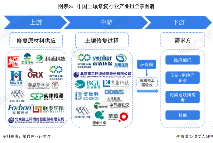 目前国内从事土壤修复的企业越来越多,由于预期土壤修复市场规模巨大,各行各业都开始往这方面发展。从产业链角度看,上游专注土壤设备研发的企业有新地标、科盛科技等;检测设备制造厂商有实朴检测、富邦股份等。在中游环节,我国土壤修复行业既有综合性企业,如建工修复、森特股份等企业产业链布局完善;也有专注于修复咨询、技术支撑、调查评估、修复工程、第三方检测等具体领域的企业,如中节能大地、京蓝科技、高能环境等。后期土壤修复工程监测和验收工作主要由各地方环保局开展。