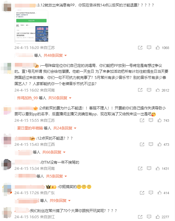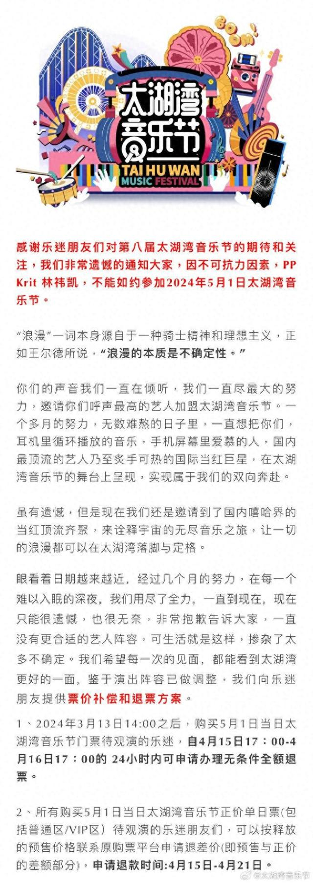 4月15日下午,太湖湾音乐节发布通知,告知消费者因不可抗力因素,泰国艺人林祎凯(昵称pp)不能如约到场,并发布了5月1日票价补偿和退票方案。距离开场还有半个月但是艺人阵容突发变更,这引发了消费者尤其是林祎凯粉丝的强烈不满。