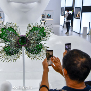 海南海口,第四届中国国际消费品博览会正在举办。图为一款利用AI设计的环保艺术作品,吸引参观者。(图片由CNSPHOTO提供)