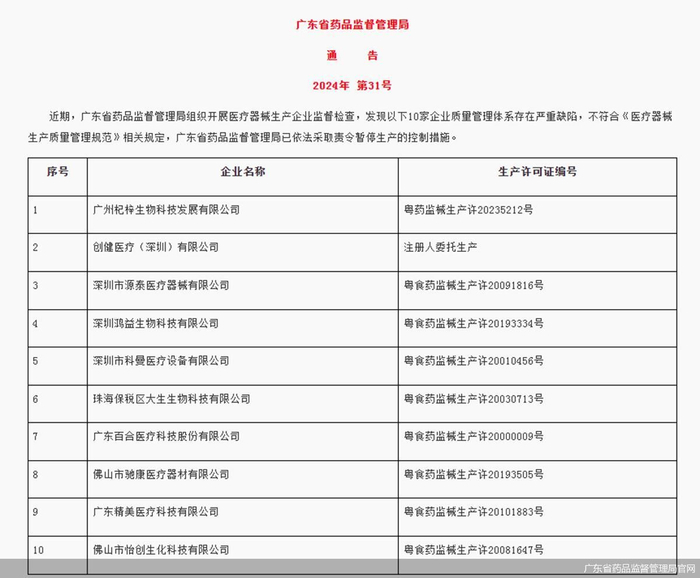 百合医疗此次被暂停生产的原因是质量管理体系存在严重缺陷,不符合《医疗器械生产质量管理规范》相关规定。根据广东省药品监督管理局发布的通告,除百合医疗外,还有创健医疗、科曼医疗、杞梓生物、精美医疗等企业被暂停生产。