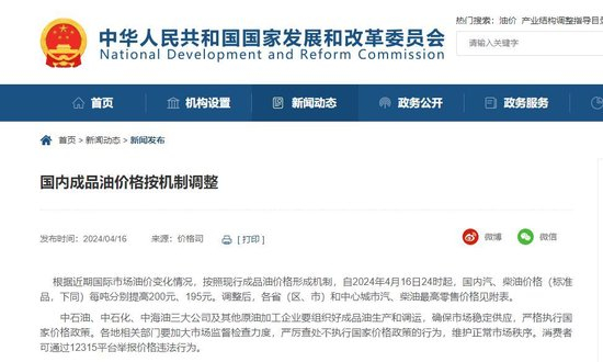 中新经纬4月16日电 据国家发改委网站16日消息,根据近期国际市场油价变化情况,按照现行成品油价格形成机制,自2024年4月16日24时起,国内汽、柴油价格(标准品,下同)每吨分别提高200元、195元。