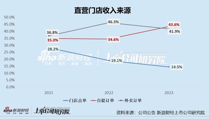 奈雪的茶将用户消费场景分为三种:一是门店点单——现场下单并支付;二是自提订单——使用微信/支付宝小程序或奈雪APP(包括现场使用);外卖订单——需要配送服务的订单。通过奈雪的茶直营门店分收入来源的表现情况,我们可以看到“门店点单”模式销售占比持续下降。2021年-2023年,“门店点单”模式销售占比分别为28.2%、19.1%、14.5%,相反外卖和自提订单占比较大幅度提升,已成为消费主流。