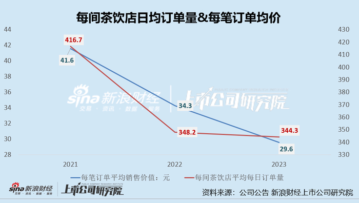 2023年,奈雪的茶直营门店单笔订单平均销售价格和单家门店每日订单量均较2022年度有所下降。2021-2023年,奈雪的茶直营门店每间茶饮店平均每日订单量分别为416.7单、348.2单、344.3单,其中2023年同比下降1.12%;每笔订单平均销售价格分别为41.6元、34.3元、29.6元,其中2023年同比下降13.7%;每间茶饮店平均每日订单量为344.3,同比下降1.12%。