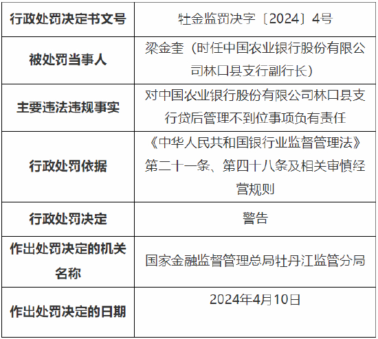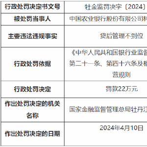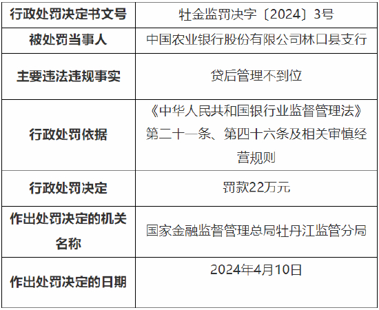 4月16日金融一线消息,国家金融监督管理总局牡丹江监管分局行政处罚信息公开表显示,中国农业银行股份有限公司林口县支行因贷后管理不到位,被国家金融监督管理总局牡丹江监管分局罚款22万元;两名相关责任人被警告。