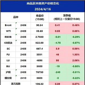 周二国际油价盘中略有回落,截至国内15:00收盘,Brent 06合约日环比上涨0.41美元至90.34美元/桶,SC2405合约录得上涨3.9元/桶至667.4元/桶。