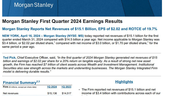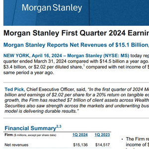财报显示,摩根士丹利第一季度营收为151.4亿美元,好于市场预期的144.6亿美元。一季度净利润为34亿美元,合每股2.02美元;上年同期为30亿美元,合每股1.70美元。