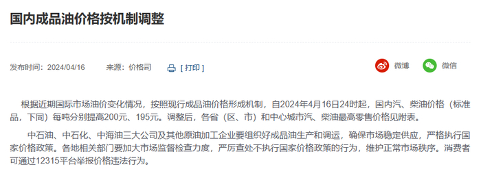 值得注意的是,根据“十个工作日”原则,下一轮成品油零售调价窗口将在2024年4月29日24时开启。