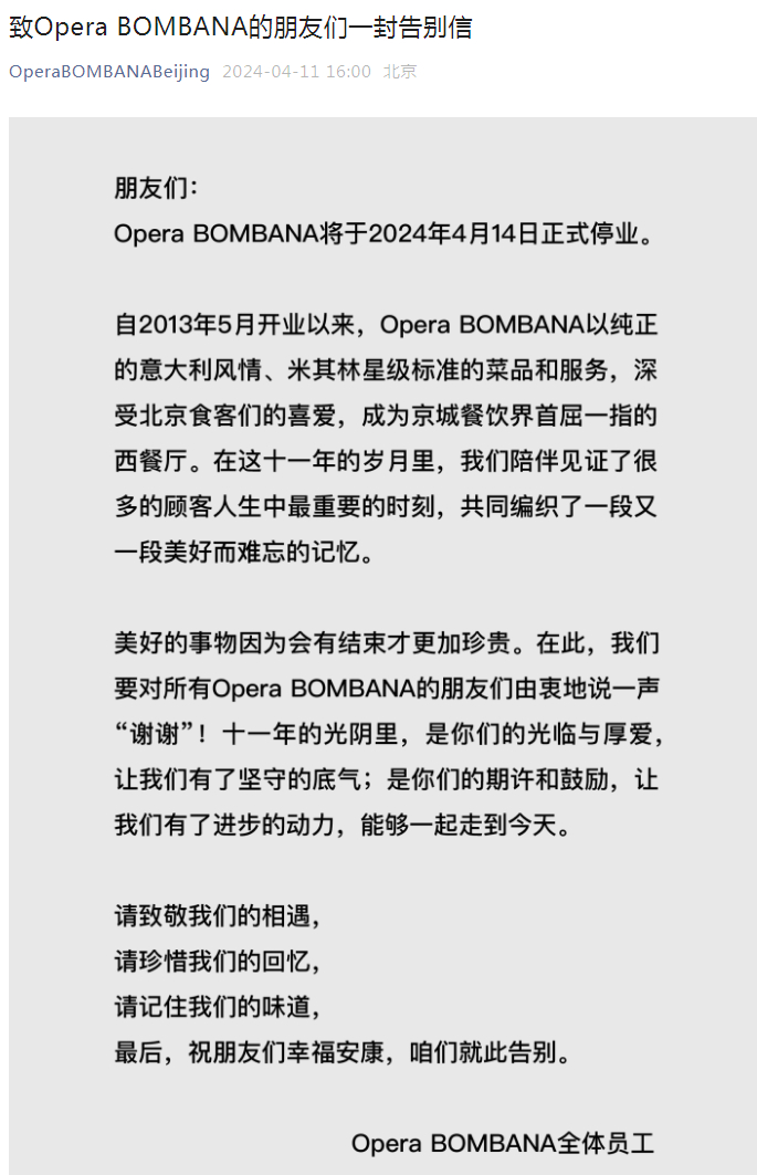 “朋友们:Opera BOMBANA将于2024年4月14日正式停业⋯⋯祝朋友们幸福安康,咱们就此别过。”