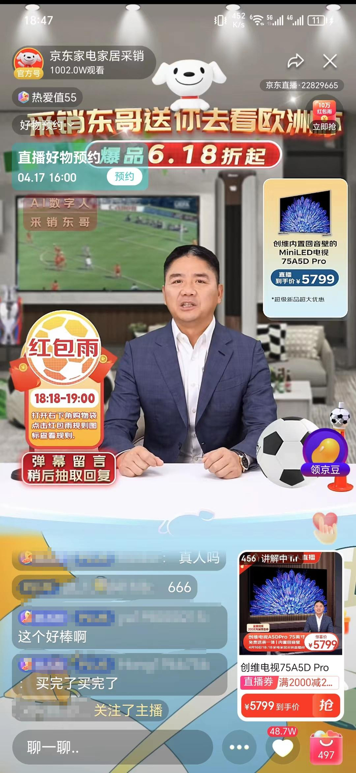 4月16日晚6点18分,刘强东准时出现在京东家电家居采销直播间和京东超市采销直播间。不过,此次出镜带货的并非刘强东本人,而是其数字虚拟人分身“采销东哥”。开播不足半小时,两大直播间就吸引了超1000万次观看。