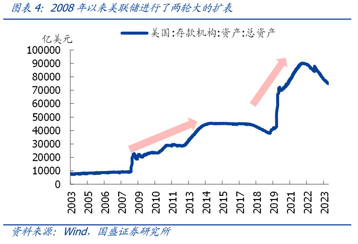 >黄金价值稳定,在全球货币超发、流动性泛滥的的背景下,黄金配置需求增加。回顾看,2008年金融危机后,发达国家央行扩表速度明显加快,2020年之后,扩表速度进一步加快。以美国为例,美国存款机构最新资产规模达7.49万亿美元,较2019年底增长了78%、较2008年底增长了229%。在货币超发的背景下,一方面发达国家的货币超发需要增持黄金来增强本国主权货币的信用,另一方面发展中国家由于发达国家货币超发导致持有的的外债资产贬值、可能增加黄金等稳定资产的配置。