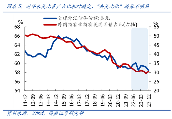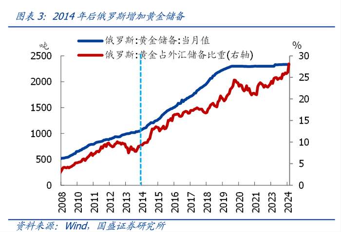 >多角度来看,近年来“去美元化”可能并非央行购买黄金的核心驱动因素。1)根据世界黄金协会的调查,在央行等机构的购金决策的影响因素中,多数是出于黄金的历史地位、避险和无违约风险的考量,认为“去美元化”与购金高度相关的仅4%、占比明显靠后;2)“去美元化”诉求较为强烈的国家,如俄罗斯增加的黄金净购买量并不大(2022至今仅增加黄金储备28吨,明显低于2014-2019年);3)美元在全球外汇储备中的占比未有明显下降,2022年以来始终维持在58.5%上下,美国国债的持有者结构中,外国持有者比例也始终维持在30%附近。