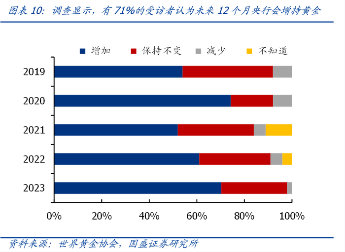 >调查显示,央行购金意愿仍然较强,央行黄金储备可能继续增长。如前所述,近年来流动性泛滥,同时地缘政治的不确定性增加,黄金配置的需求可能继续增长。根据世界黄金协会2023年年中的调查,认为未来12个月央行会增加黄金储备的比例为71%,这一比例为近五年最高、仅低于2020年。