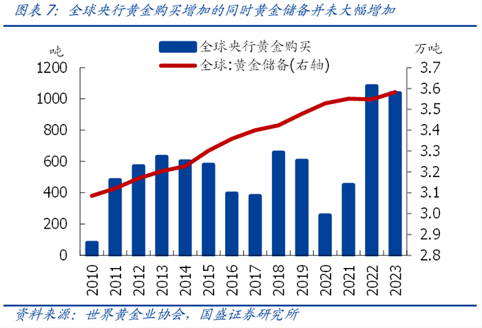>2022年以来,各国央行黄金购买规模较高、但实际黄金储备增长并不快,且结构特征明显、我国央行黄金储备增量占比近60%。如前所述,2022-2023年全球央行黄金购买量明显增长,占比较往年大幅提升。但从净购买量来看,2022-2023年全球央行黄金储备并未显著增长,其中2022年末35483吨、较上年还减少了29.3吨。结构上看,我国央行是黄金的主要净购买力量,2022年11月以来我国央行黄金外汇储备增量达309.2吨,占整体央行黄金储备增量的比重为59.3%。