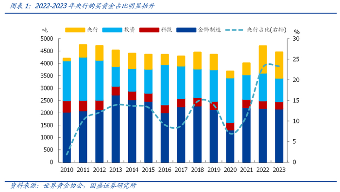 根据用途,黄金主要分为金饰制造、科技、投资以及央行需求四大方向,其中金饰制造和科技需求相对稳定,投资以及央行购金需求波动较大。近两年,央行购金在需求结构占比中明显提升,2023年全球黄金需求量为4448吨,其中央行和其他机构需求1037吨,占比23.3%、连续两年占比在20%以上(2022年占比23%),而2010-2021年这一比例均在15%以下。